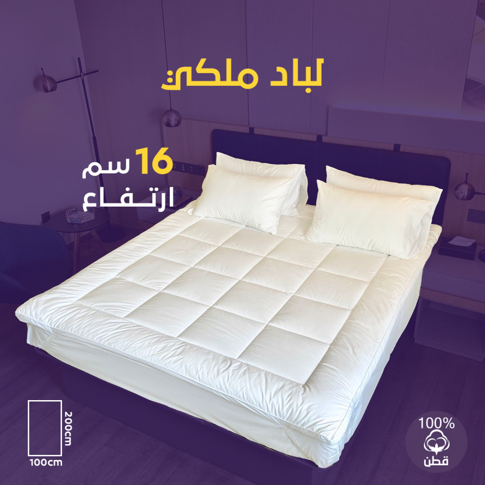 اللباد الملكي الفاخر : طبقة بمواصفات فندقية توضع بين المفرش والمرتبة لتوفير نوم مريح وعميق، مصنوعة من قماش ناعم وحشوة متناسقة تمنح دعمًا مثاليًا للجسم وتساعد على الحفاظ على الوضعية الصحيحة أثناء النوم. وللاستدامة وطول عمر المنتج، القماش قطن 100%.