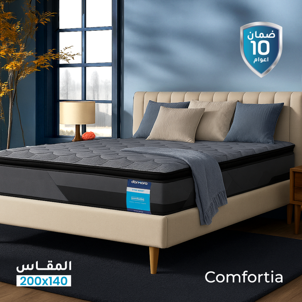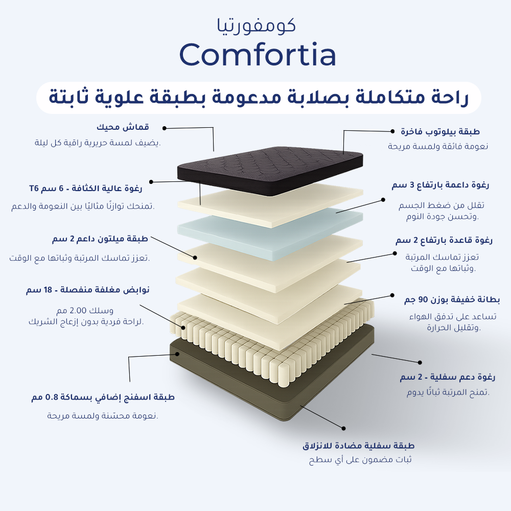 اكتشف راحة مصممة خصيصًا لتمنحك ثباتًا مثاليًا ونومًا هادئًا كل ليلة مع مرتبة كمفورتيا Comfortia، المصممة بعناية من طبقات متعددة مختارة هندسيًا لتلبي احتياجك للدعم الصلب والسطح المتوازن الناعم.