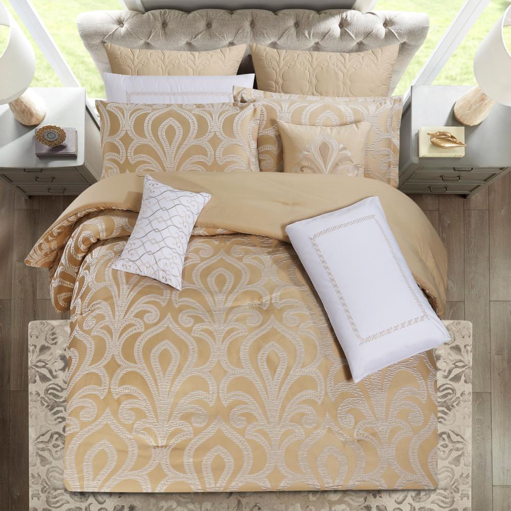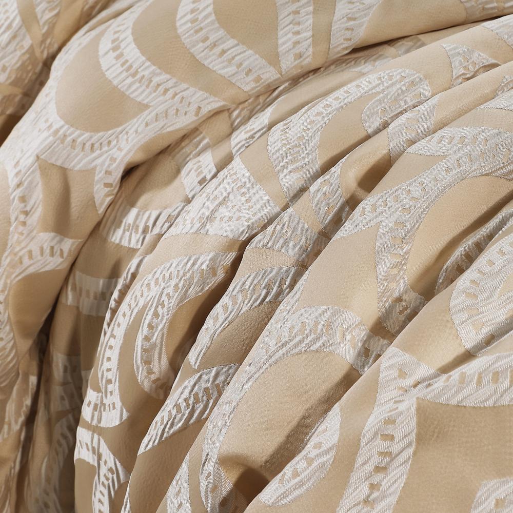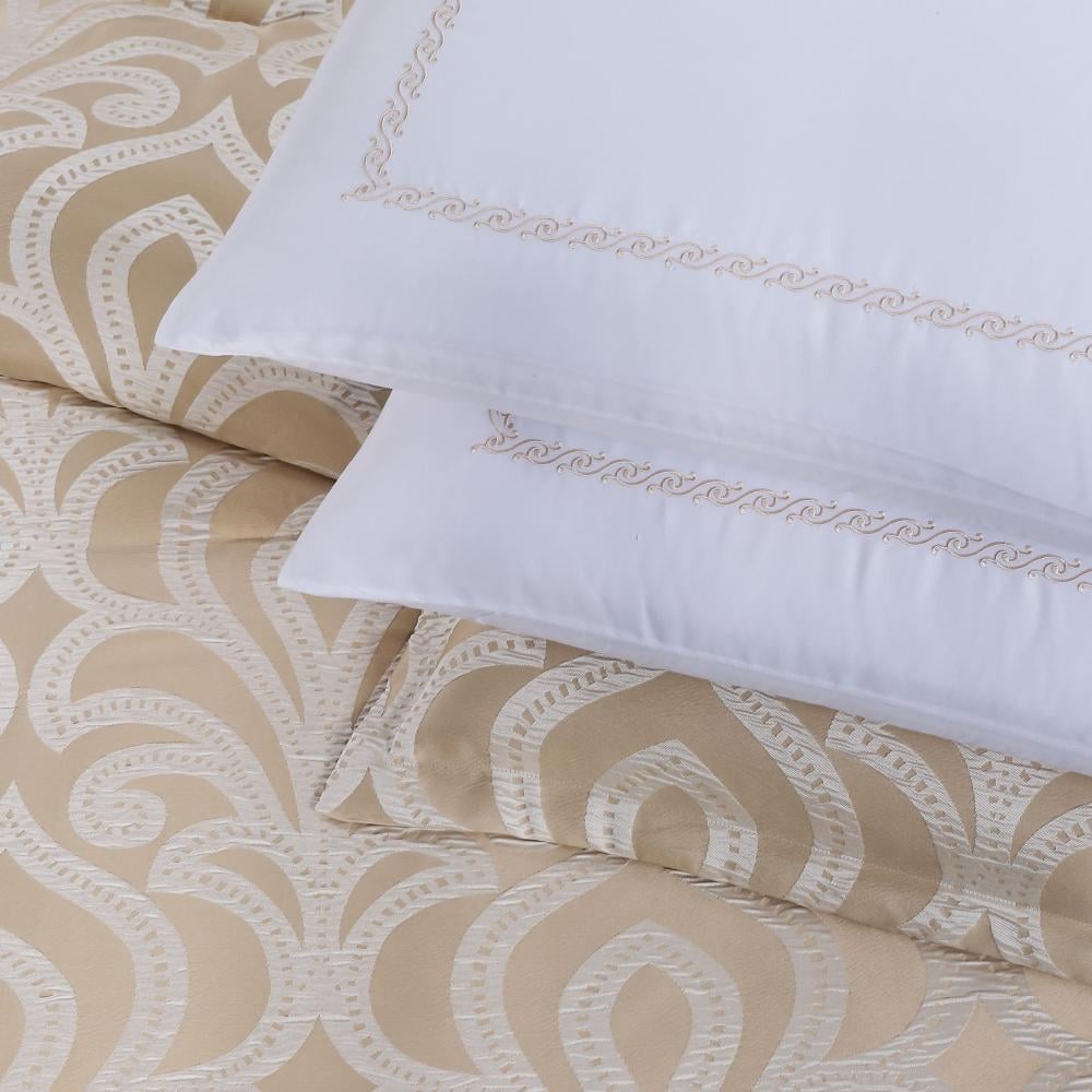 صُمم وجه المفرش من جاكار فاخر بنقشة داماسكو الملكية Royal Damask، مستوحاة من زخارف القصور الأوروبية، بتكرار كلاسيكي يضفي فخامة جريئة ومهيبة.
