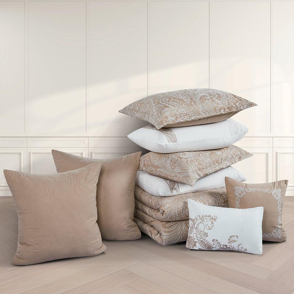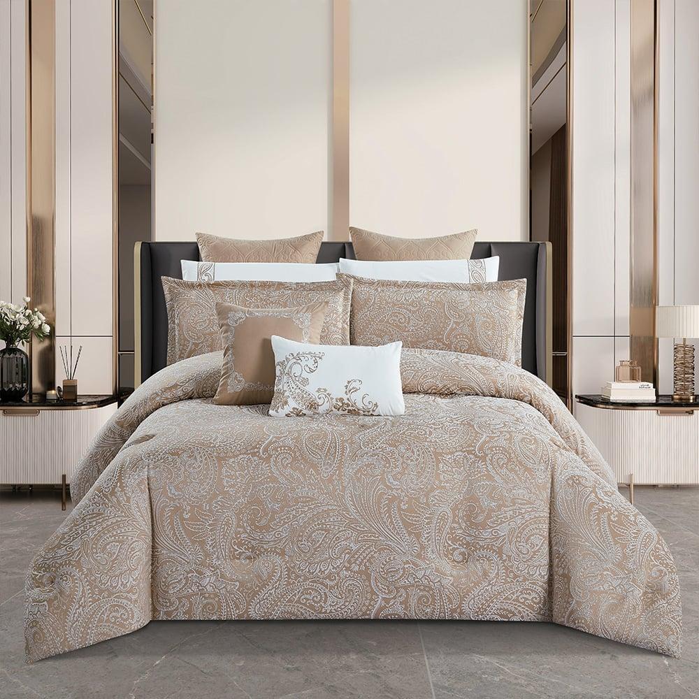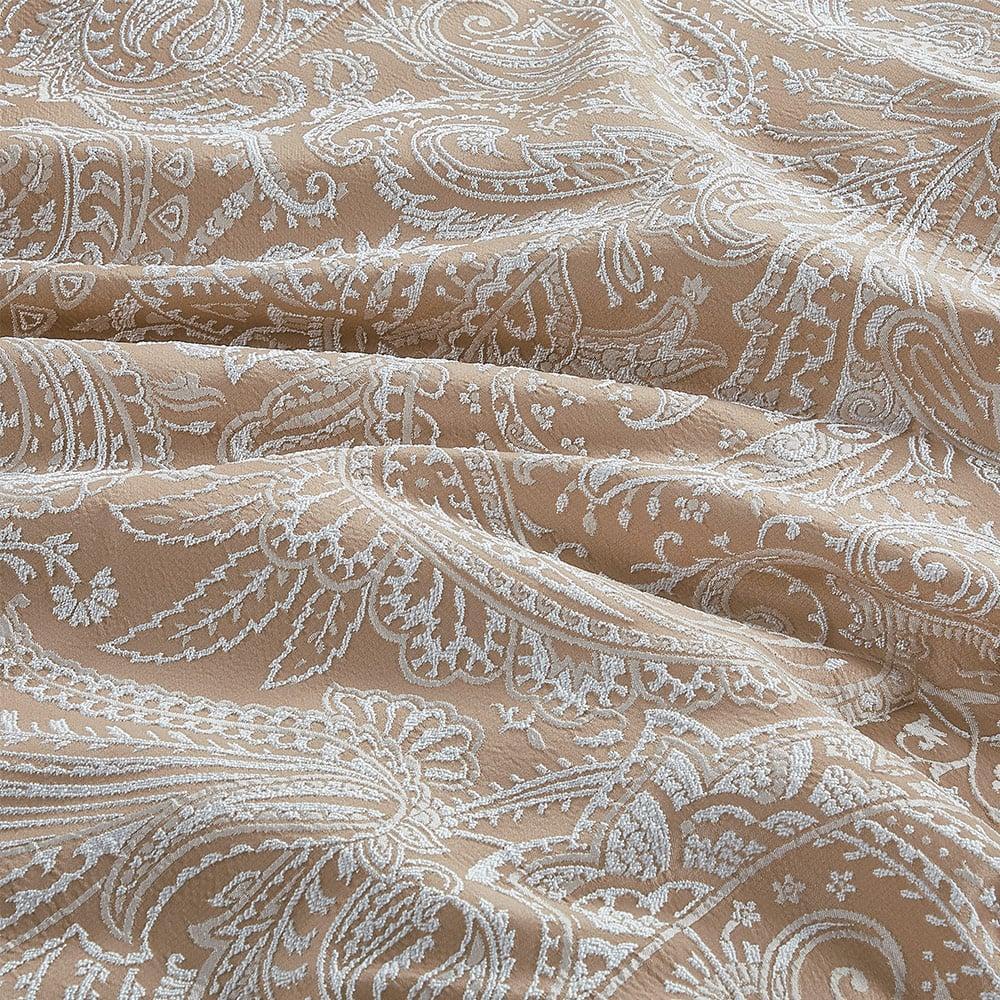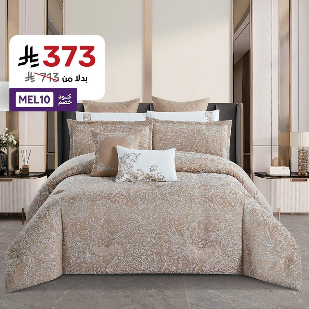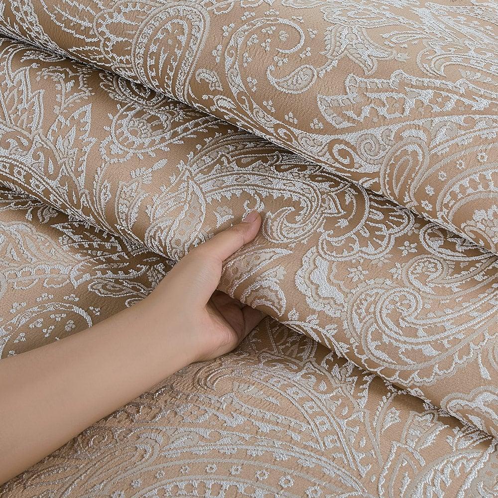 تم تصميم هذا المفرش من قماش الجاكار الفاخر بنقشة منسوجة بتصميم كلاسيكي هندسي، يجمع بين تفاصيل الروكوكو الفاخرة وتماثل زخرفي مستوحى من القصورالإيطالية تضفي طابعًا كلاسيكيًا دافئًا على غرفة نومك مع التطريز البارز اللذي يعطيك شعور الفخامة الملكية.