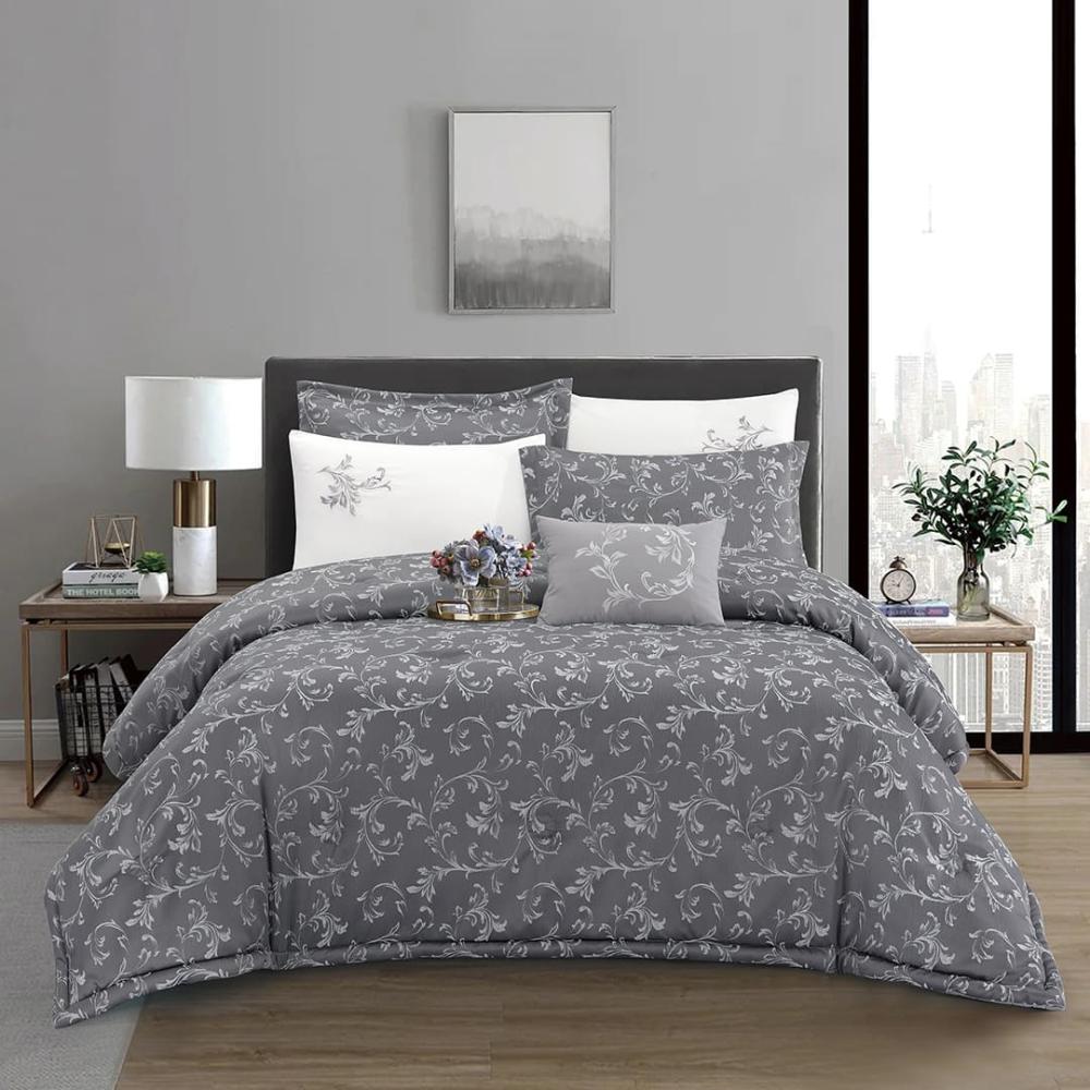 طقم مفرش فاخر مكون من 7 قطع بتصميم أنيق يجمع بين الفخامة والراحة. الوجه منسوج من قماش الجاكار الفاخر بنقوش راقية، بينما البطانة من المايكرو فايبر الناعم بديل القطن لمنحك إحساسًا مريحًا يدوم طوال الليل. اختيار مثالي لإضافة لمسة من الأناقة إلى غرفة نومك.