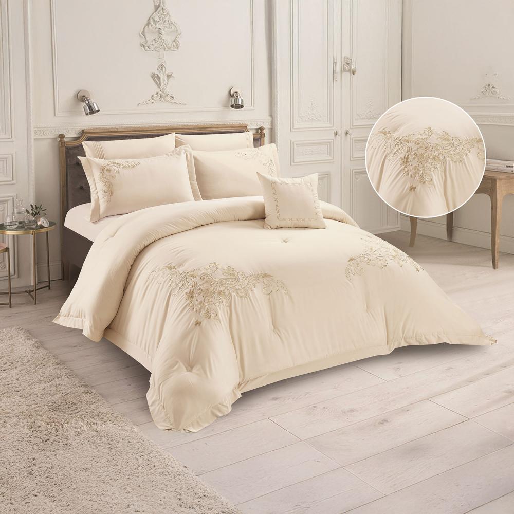 مفرش صيفي مزدوج 7 قطع مطرز – "اناهيد" | فخامة التفاصيل ونعومة الصيف