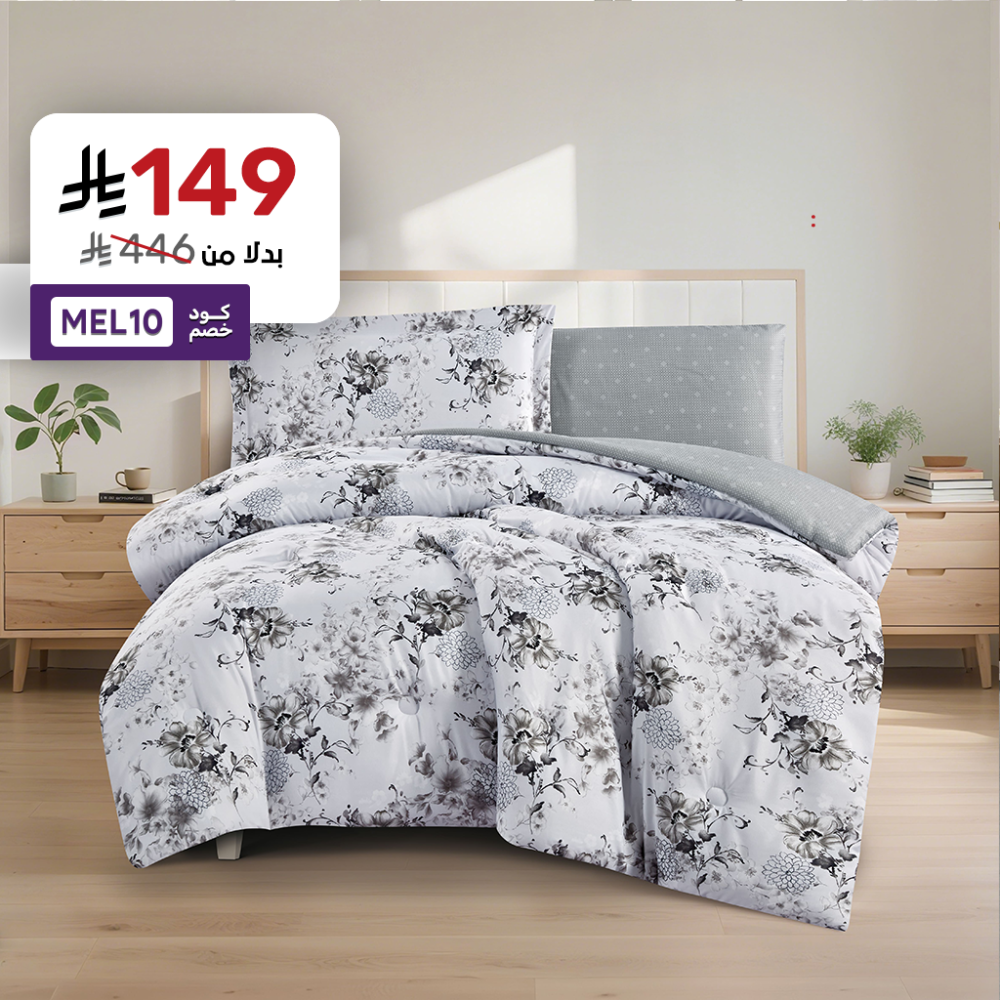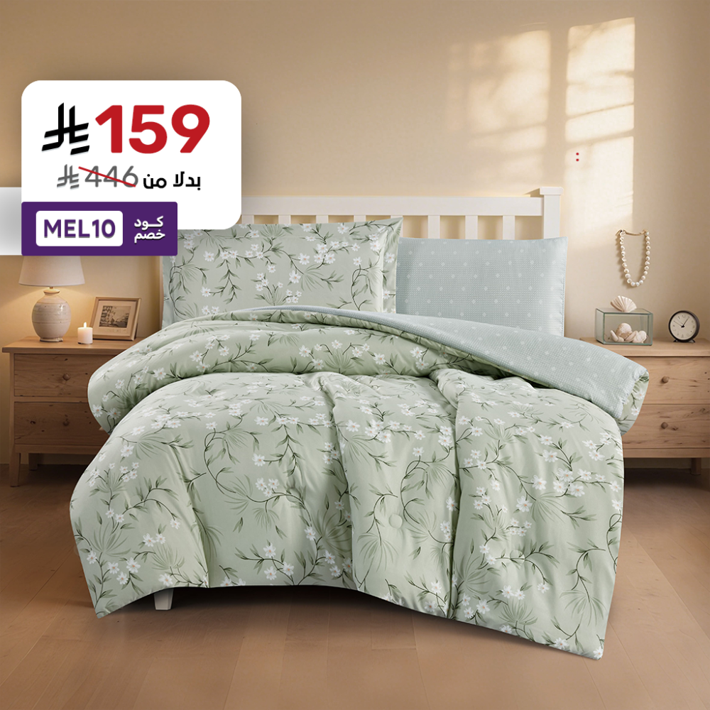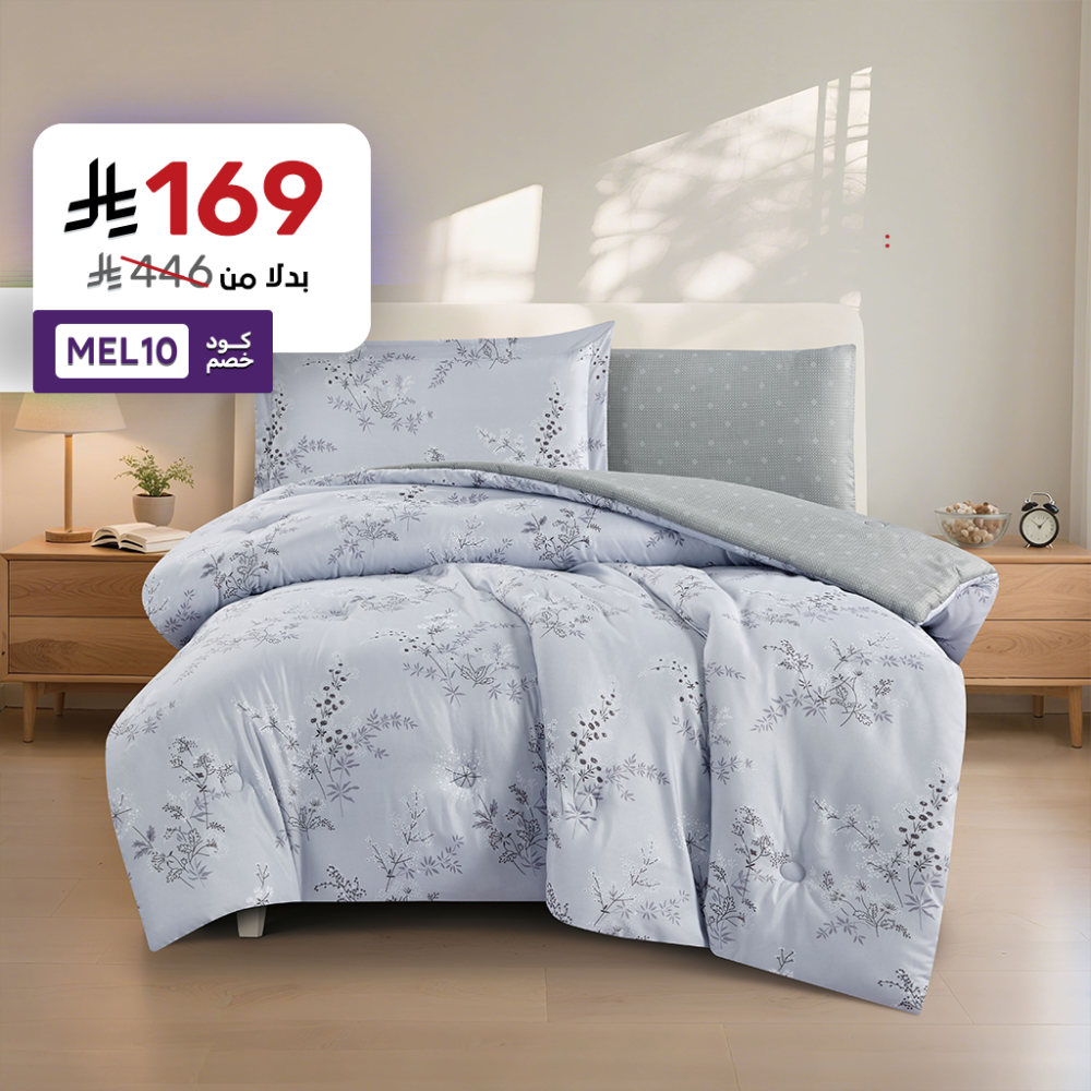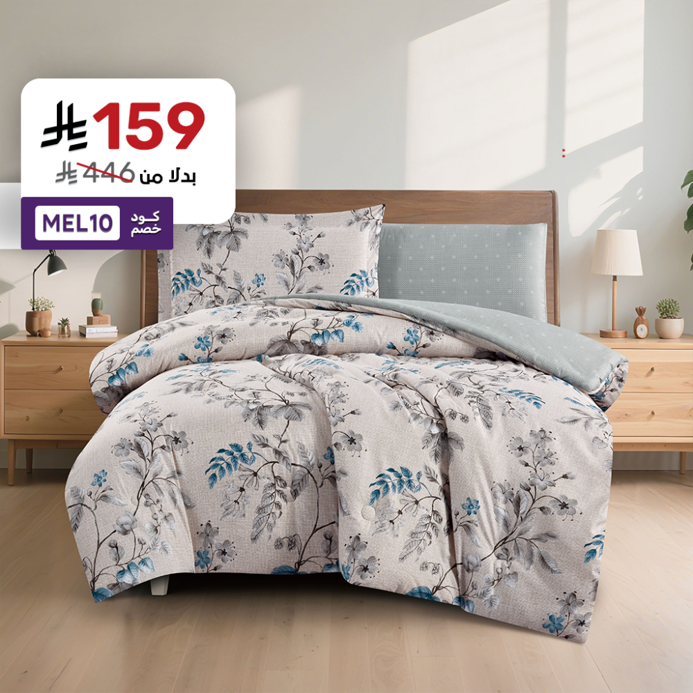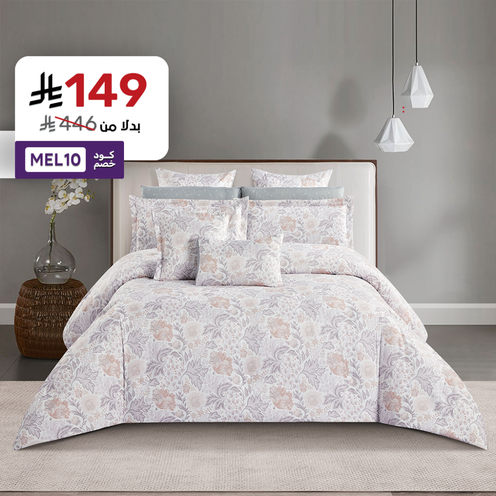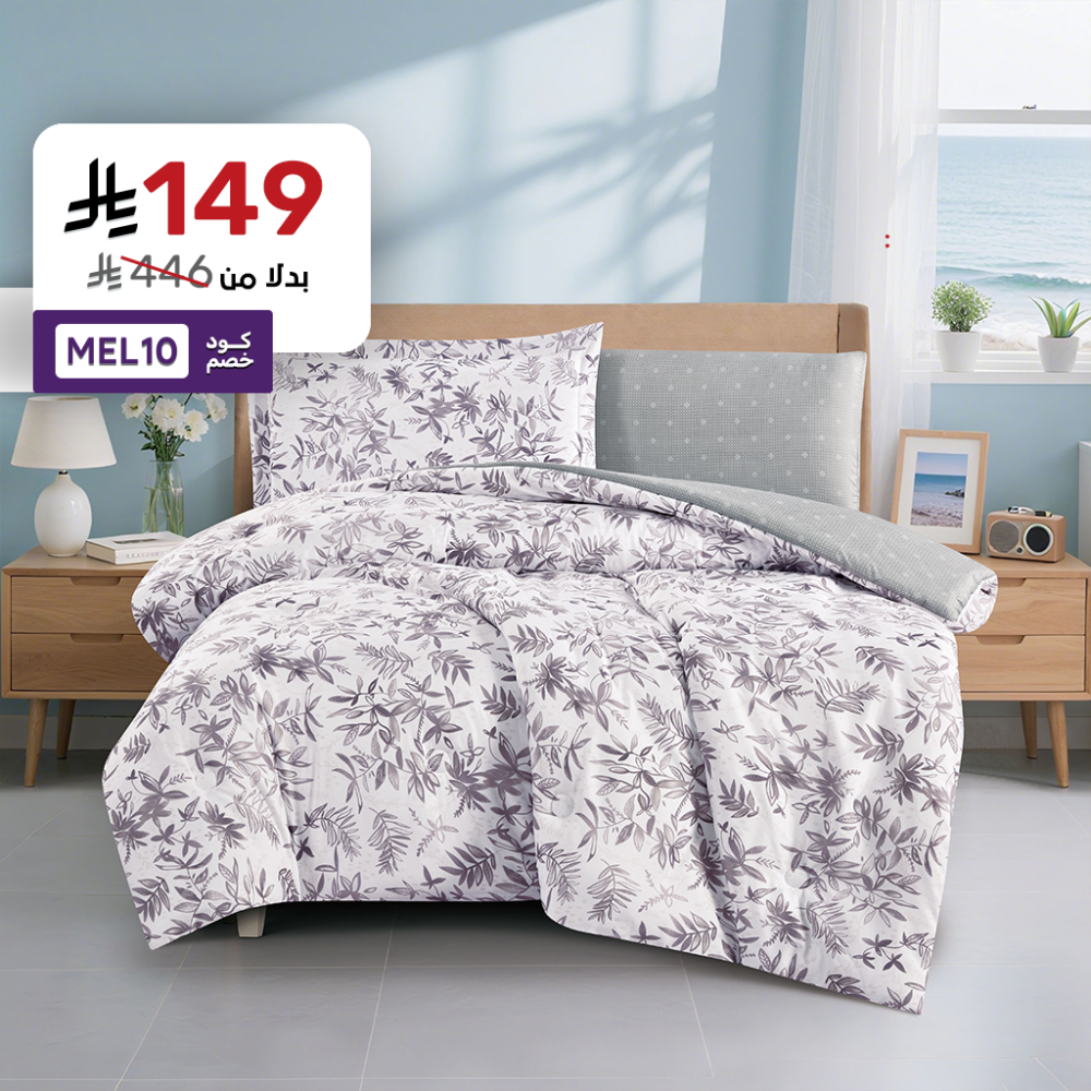 حوّل غرفة نومك إلى واحة من الراحة والجمال مع المفرش الصيفي الأنيق . صُمم بخامة ناعمة وخفيفة تمنحك برودة وانتعاش طوال الليل، مع تفاصيل أنيقة وألوان راقية تضيف لمسة سحرية لسريرك.